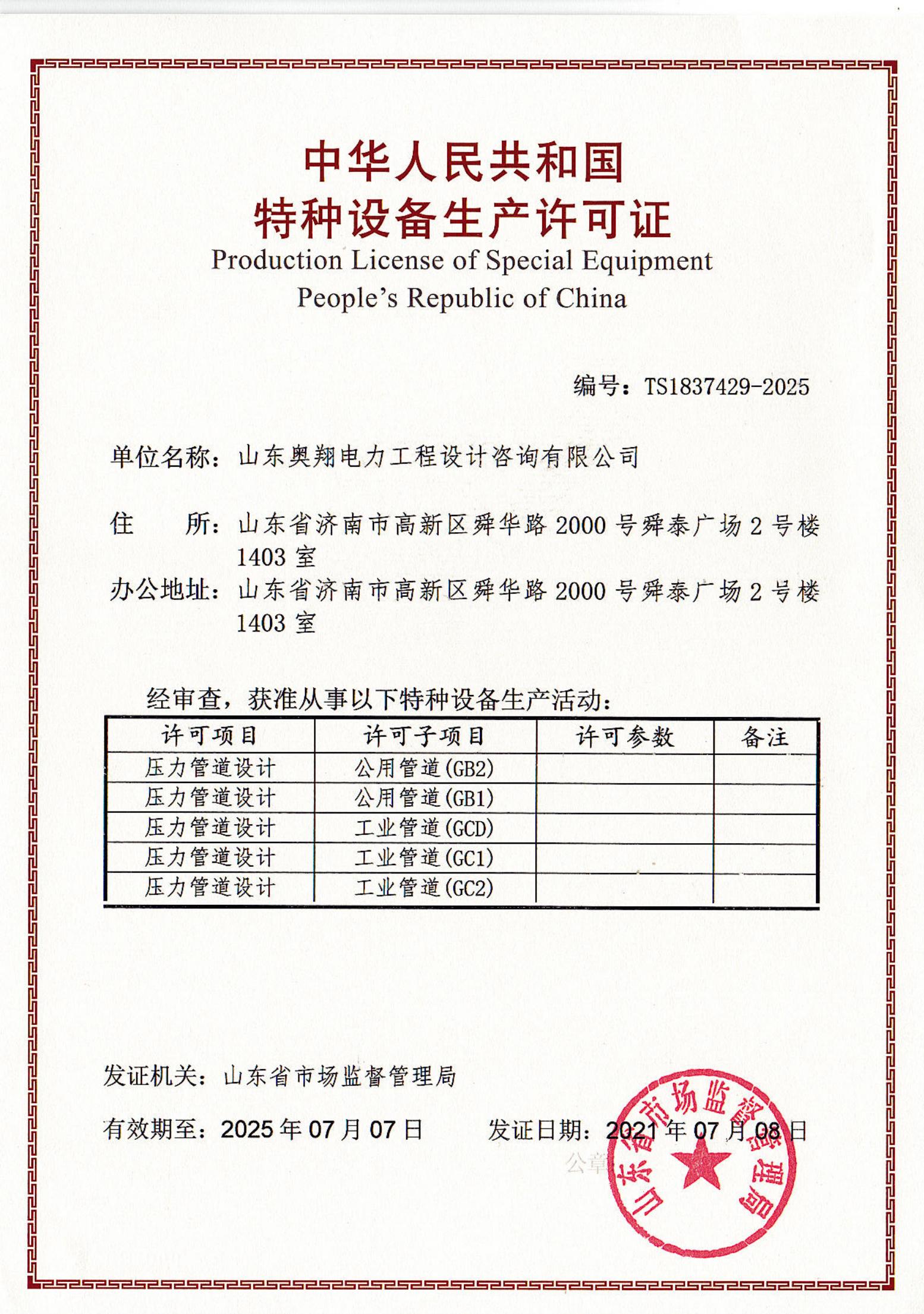 近日,在山东省市场监督管理局最终审核后,山东奥翔完成了特种设备设计许可证书换证工作,实现了GB1,GB2,GC1,GC2,GCD级别压力管道设计特种设备许可证的延续。
